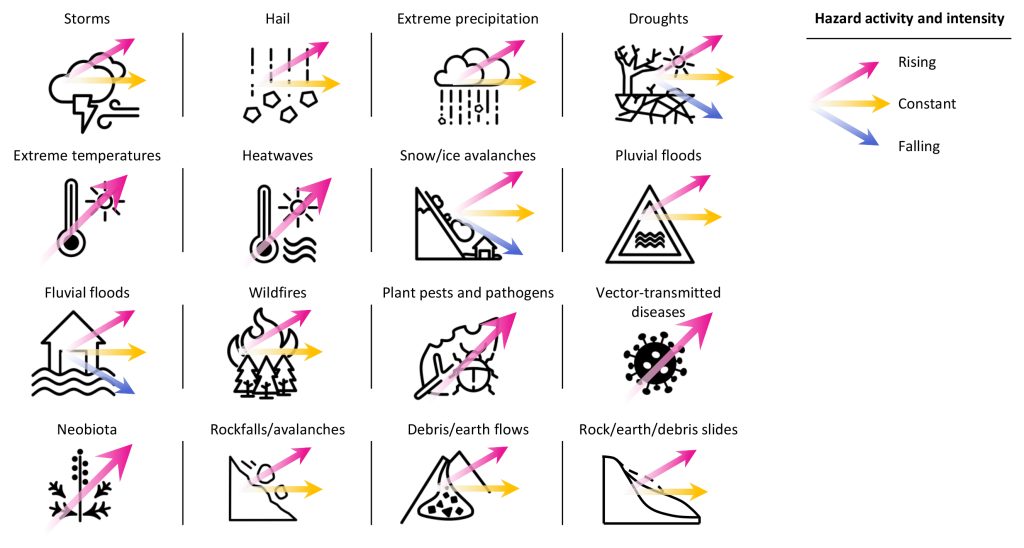 Im Zweiten österreichischen Sachstandsbericht zum Klimawandel werden folgende Naturgefahren mit erhöhtem Potenzial genannt: extreme Temperaturen, Hitzewellen, Pflanzenschädlinge und -krankheiten, vektorübertragene Krankheiten und invasive Pflanzenarten. Ob die Häufigkeit von Stürmen, Hagel, Extremniederschlägen, niederschlagsbedingten Überschwemmungen, Waldbränden oder Massenbewegungen (Muren) zunimmt oder gleichbleibt, gilt derzeit als unsicher. Ein Rückgang dieser Ereignisse ist jedoch nicht zu erwarten. Für Flussüberschwemmungen, Schneelawinen und Dürren lässt sich für Österreich kein eindeutiger Trend feststellen.